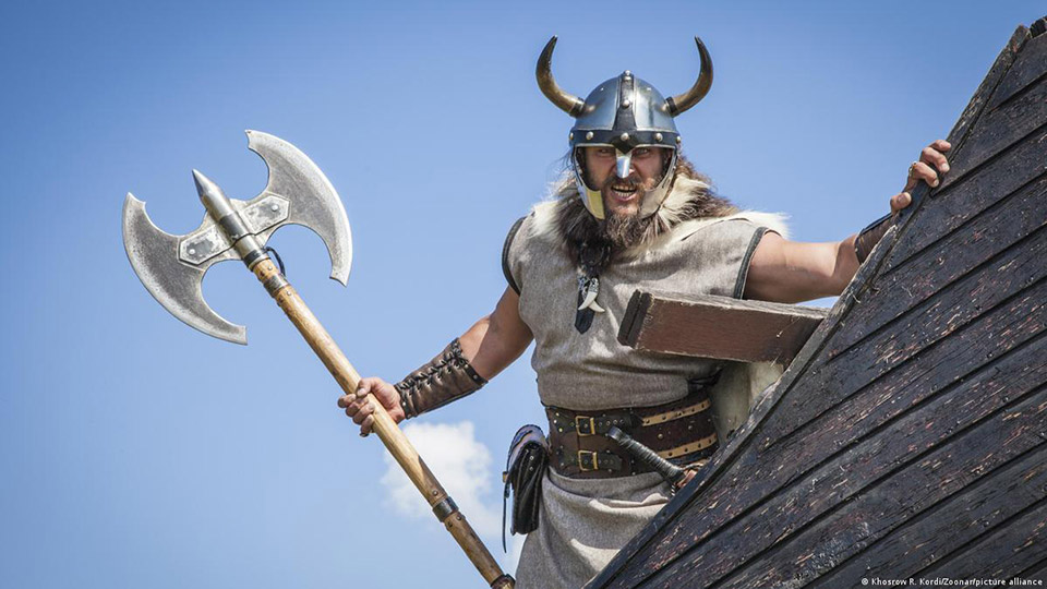 Human Created Long Description: This image shows a man dressed in a viking costume standing on the roof of a house. He is holding an axe in one hand and his other hand is against the roof. The sky is clear and blue. There are no trees in the background. The man is wearing a Viking helmet with two horns sticking out of either side, a cloth toga and a long beard. He looks determined and ready for battle. The image is well composed, with the man standing in the center of the frame and the axe providing a sense of movement and action. The overall mood of the image is one of adventure and bravery.